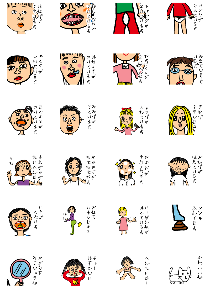 言葉で伝えるのはちょっとためらうことを子供が描いた絵で伝えるスタンプ。鼻毛が出てる。パンツが見えてる。口が臭い。言いにくいことは、かわりに子供に言ってもらおう。